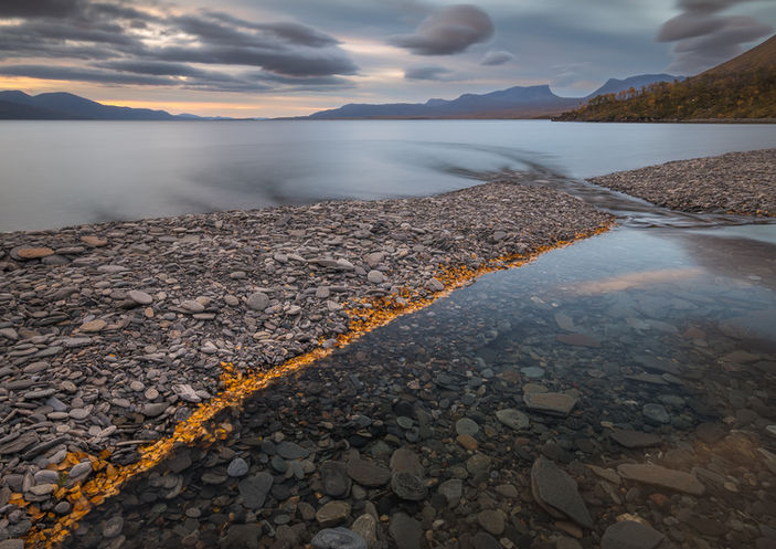 1. Bilden fångar ett vackert och avskalat landskap där vattnet möter en stenig strand i en harmonisk balans. Kompositionen är väl genomtänkt med ett tydligt flöde från förgrund till bak-grund. De mörkgrå stenarna i kontrast mot den klara, reflekte-rande vattenytan skapar en fin dynamik i bilden. Bilden har en utmärkt detaljrikedom, särskilt i förgrunden där stenarnas tex-tur och variation framträder mycket tydligt. Den långa expone-ringen gör att vattnet blir mjukt och silkeslent, vilket ger en fin kontrast till de hårda stenarna. Molnen har en subtil rörelse-oskärpa som förstärker känslan av tidens gång. Den ljusa kan-ten av gyllengula löv längs vattenbrynet ger en mjuk men ef-fektfull färgaccent som leder ögat genom bilden. I övrigt däm-pade och naturliga färger, vilket ger en lugn och harmonisk känsla. De avlägsna bergen och himlens dramatiska moln skapar djup och balans. En mycket stämningsfull och genom-tänkt bild och en värdig vinnare. Vi gratulerar till förstaplatsen!